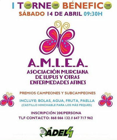 La nueva delegación en Cartagena de la asociación AMLEA, asociación de enfermos de Lupus y enfermedades afines, además se ha organizado un torneo benefico de pádel el día 14 de abril en las instalaciones de Padel 4 para que la gente de Cartagena se acerque además de poder apuntarse como jugadores, conocer la asociación.