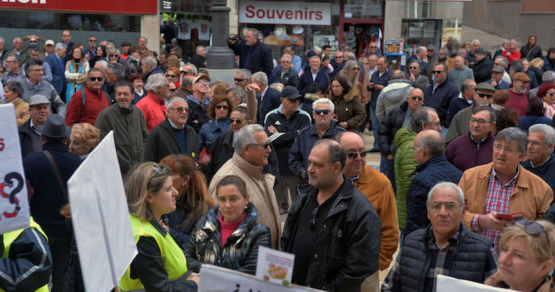 Un informe publicado por el sindicato de técnicos del ministerio de Hacienda (Gestha) refleja que más de tres millones de jubilados en España cobran por debajo del umbral de la pobreza, es decir, que no llegan a 8.200 euros anuales. El porcentaje es del 32,6%, que varías según las comunidades autonómicas, desde el 23,8% de Asturias al 45,4% de Melilla, situándose en el 38,8% en la Región de Murcia. Esta mañana, pese al tiempo desapacible, más de dos mil personas se han concentrado en la plaza del Ayuntamiento en una nueva protesta por las pensiones.