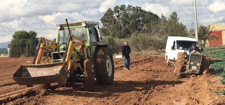 Vecinos del paraje ubicado entre Molinos Marfagones y La Aljorra, reclaman el arreglo de los caminos de acceso a viviendas y naves después de que las lluvias caídas ayer provocasen que una furgoneta quedase clavada en el barro, lo mismo que le ocurrió a un camión-grúa y a un tractor que trataron de sacarlo, siendo finalmente un tractor pala, con mayor tracción, el que tuvo que rescatar a los tres vehículos.