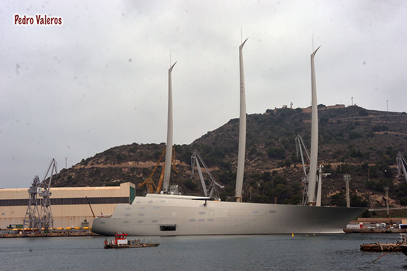 Sailing Yatch A, considerado como uno de los más grandes yates asistido con vela del mundo, vuelve a estar estos días en aguas de la dársena de Cartagena, en las instalacines de Navantia, donde suele llevar a cabo los chequeos. Tiene bandera de Bermudas y su eslora alcanza los 142,81 metros de longitud.