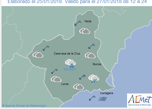 La Agencia Estatal de Meteorología establece establece aviso sobre fenómeno adverso de nivel amarillo por fenómenos costeros para el próximo sábado en las zonas de Campo de Cartagena y Mazarrón. También se anuncia una bajada de temperaturas y la aparición de lluvias.