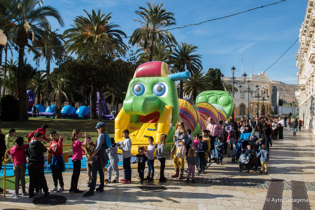 Los hinchables gratuitos, instalados en la plaza de Héroes de Cavite, están haciendo las delicias de los pequeños desde el pasado día 22 de diciembre. Grandes colas atestiguan el gran éxito de está atracción infantil que el Ayuntamiento de Cartagena, a través de la Concejalía de Festejos, ha vuelto a poner a disposición de ellos durante la Navidad.