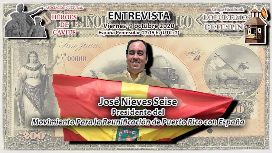 El grupo de Facebook 'Los últimos de Filipinas' y la asociación cultural 'Héroes de Cavite' cambia el formato de sus actividades y en lugar de una conferencia ofrece hoy una entrevista a José Nieves Seise, presidente del Movimiento para la Reunificación de Puerto Rico con España.Leer más: El ciclo 'contra la leyenda negra de España' trae hoy un nuevo capítulo