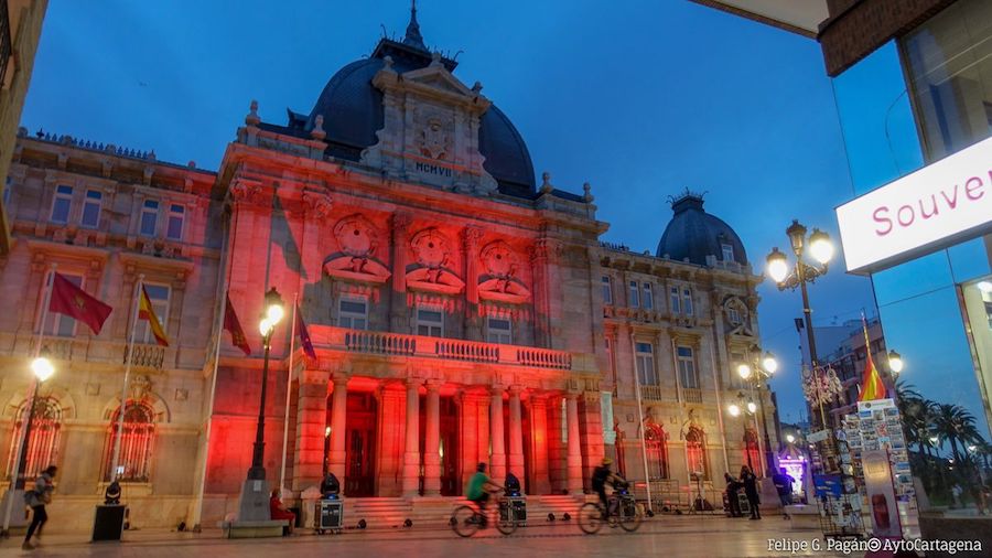 Cartagena también se puso anoche en 'alerta roja' por la cultura en una iniciativa que ha abarcado a unos cuarenta edificios emblemáticos de la Región de Murcia para llamar la atención sobre la situación del sector que atraviesa este gremio.