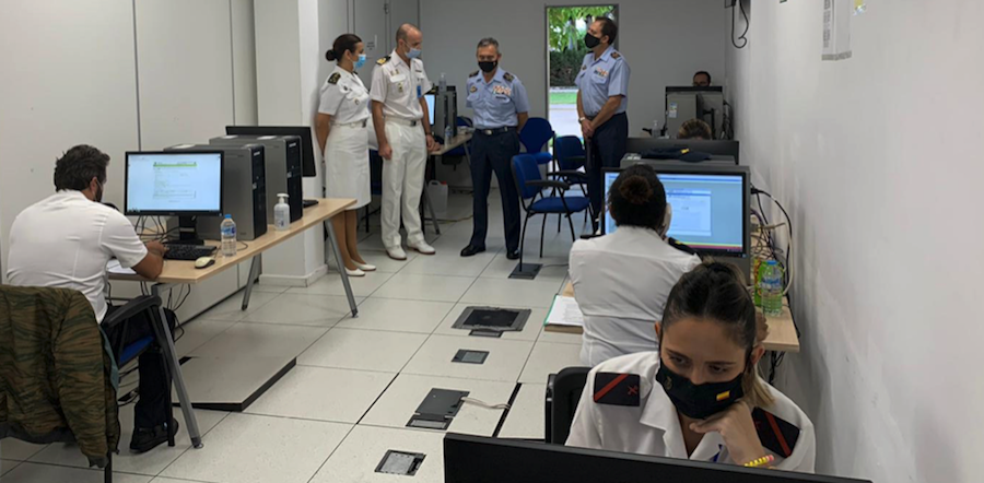 El general del aire Miguel Ángel Villarroya, ha realizado este viernes su primera presencia oficial en Cartagena, donde ha recorrido las diferentes instalaciones del cuartel general de la MOM y el centro de operaciones y vigilancia de Acción Marítima (COVAM). En la imagen, en la sala donde están los rastreadores de Covid de la Armada.