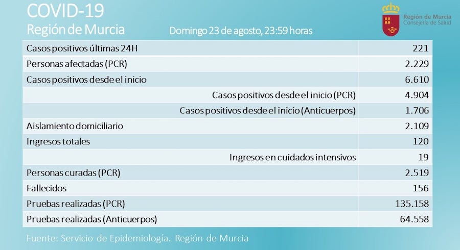 • El último día ha registrado 221 nuevos casos, de los que 16 se localizan en Cartagena