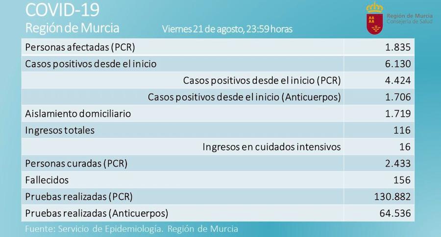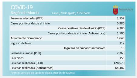 El total de infectados detectados en la Región en el último día es de 155, alcanzando el total los 1.757 y siendo el municipio de Murcia el que más sigue acumulando. La cifra de hospitalizados sube de 106 a 112 y la de UCI se mantiene.