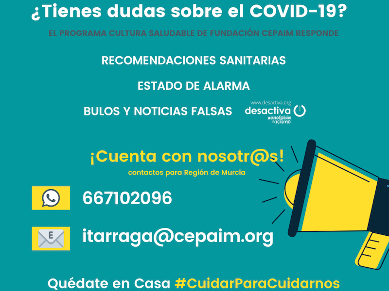 El proyecto 'Cultura Saludable' de Fundación Cepaim en Cartagena responde a tus dudas sobre la situación ocasionada por la alerta sanitaria por el coronavirus. Recomendaciones sanitarias, Estado de Alarma, bulos y noticias falsas son algunas de las consultas que más han llegado al equipo, que recurre a fuentes y profesionales fiables para resolver las dudas que pueda tener la ciudadanía. Se pueden hacer consultas a través del teléfono, por WhatsApp o por correo electrónico.Leer más: ¿Tienes dudas sobre el Covid-19? Te ayudamos