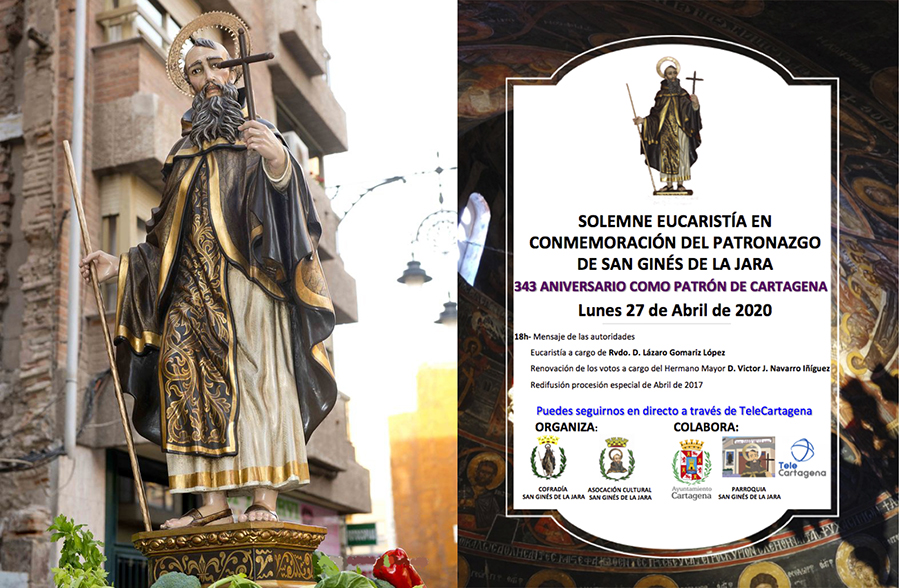 Con motivo de esta efeméride que tiene lugar este lunes, 27 de abril, donde se cumplen 343 años desde que el santo ermitaño es patrón de Cartagena, este año la Cofradía de San Ginés de la Jara con motivo de la epidemia que está asolando el planeta va ha realizar una programación especial con una eucaristía oficiado por su capellán, Lázaro Gomariz, y la renovación de votos a cargo del hermano mayor, Víctor Navarro, actos que serán transmitidos en directo por TeleCartagena.