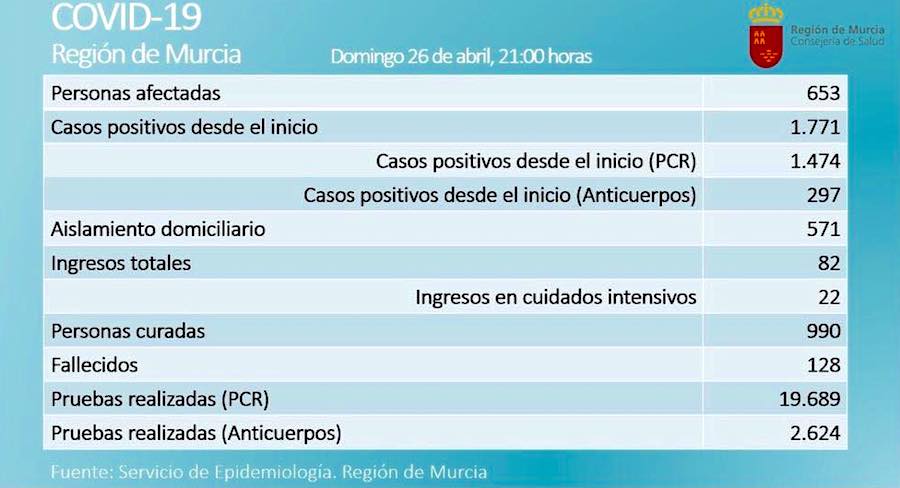 La cifra facilitada por el Servicio de Epidemiología de la Región de Murcia esta noche refleja que las personas que actualmente están infectadas por el coronavirus ha pasado de 724 a 653, mientras que se mantiene el número total de infectados en 1771, sin incrementos. Ingresos hospitalarios hay 13 menos y ha fallecido una persona.