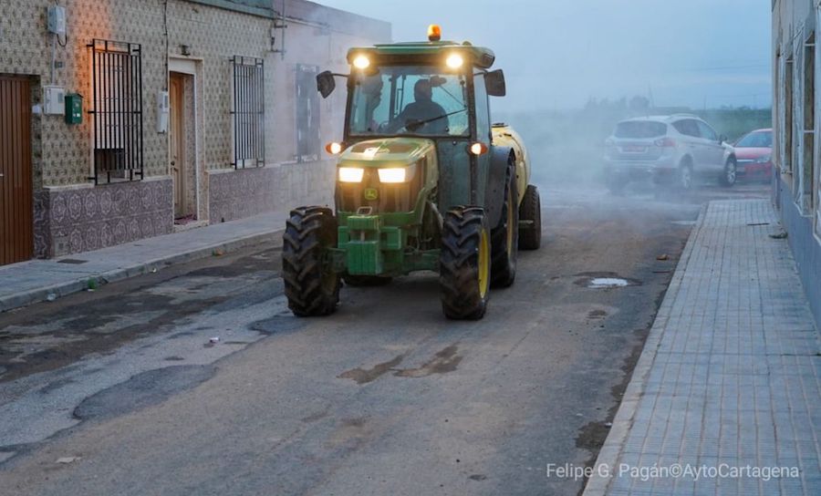 Más de una treintena de tractoristas se han sumado a las labores de desinfección, que comenzaron ayer en Pozo Estrecho y en El Algar, en colaboración con el Ayuntamiento de Cartagena, y que continúan hoy por Los Urrutias, Punta Brava y La Palma.