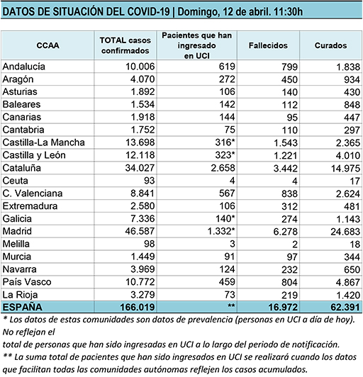 Casos totales: 166.019 (+4.167). Últimas 24 horas: 4.167 (-663). Recuperados: 62.391 (+3.282). Fallecidos: 16.972 (+619). La cifra de muertes supera la que se registró el sábado (fue de 510) y el porcentaje total de recuperados ya está en el 37% sobre los casos totales de infectados.