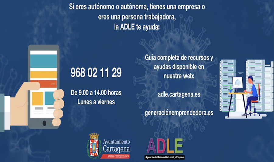 La Agencia de Desarrollo Local y Empleo del Ayuntamiento de Cartagena ha habilitado un servicio de atención telefónica para facilitar información y resolver dudas a personas trabajadoras, autónomos y empresarios que estén sufriendo los efectos de la crisis provocada por el Covid-19. Para asesorarse a través de este servicio, que funcionará de 9:00 a 14:00 horas, se podrá llamar al número 968 02 11 29.