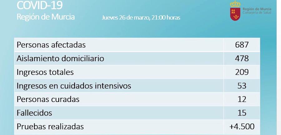 Siete personas han fallecido en las últimas 24 horas, según reflejan los datos que la Comunidad Autónoma ofrece cada día a las 21 horas. La cifra de afectados por el coronavirus se sitúa en 687 y los ingresados en UCI pasan de 36 a 53. Los curados son ya 12, cuando la jornada anterior eran 9.Leer más: Quince fallecidos tras un día en el que se han infectado cien residentes de la Región más