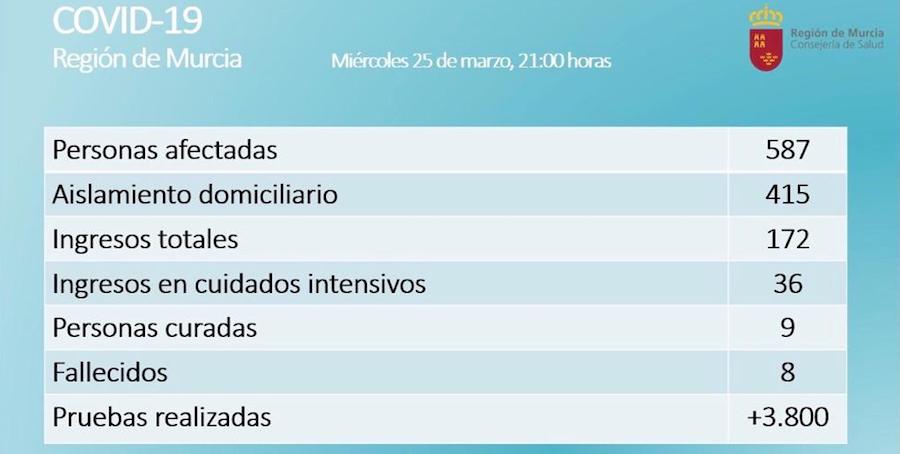 Los datos facilitados esta noche por la Comunidad Autónoma reflejan que en las últimas 24 horas se ha pasado de 477 a 596, mientras que el de fallecidos registra como último caso el de un hombre de 81 años de edad con patologías previas que ha fallecido en el hospital Reina Sofía de Murcia. Respecto a las altas médicas, la cifra pasa de 4 a 9 en un día.