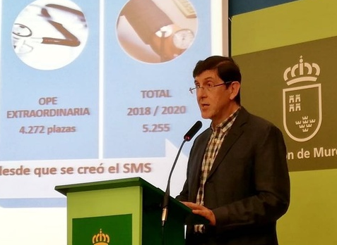 Las primeras plazas del total de las 5.255 que se convocarán en la nueva oferta pública de empleo del Servicio Murciano de Salud (SMS) saldrán a partir del próximo mes de octubre, según anunció hoy el consejero de Salud, Manuel Villegas, en rueda de prensa para explicar el proceso de reorganización de los recursos humanos del SMS, conforme al compromiso del Gobierno regional con el empleo estable y de calidad.