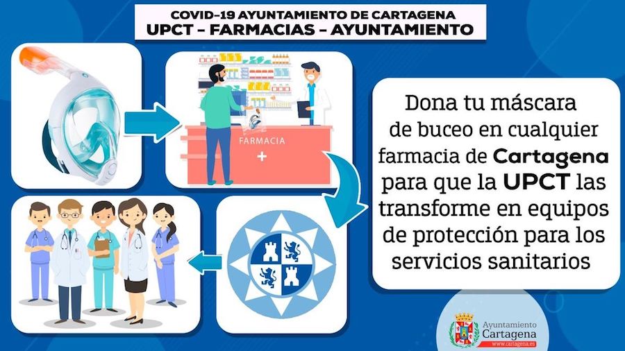 El Ayuntamiento une a las farmacias y a la UPCT para convertir máscaras de buceo en protecciones para sanitarios. Se deben entregar en los establecimientos de farmacia y después serán adaptados con el apoyo de impresoras 3D.