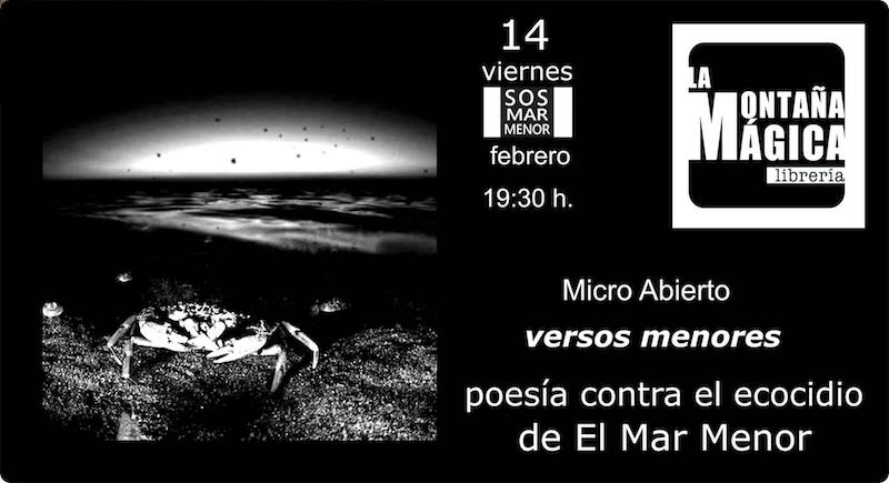 La librería Montaña Mágica acoge este viernes, a las 19.30 horas, la propuesta de " un micro abierto de poesía en el que podamos todos expresar nuestro rechazo y repulsa a los eventos acaecidos durante décadas en nuestro querido Mar Menor, albufera de nuestra infancia de atardeceres inenarrables e inspiradores sentimientos", indican los organizadores.