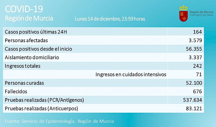 Desde la consejería de Salud se señala que los próximos días serán los que reflejen si esos días festivos generaron contagios de coronavirus que pudieran variar el descenso que la curva está experimentando en 'segunda ola' de la pandemia. España está en torno al 7 y 8% de positivos por pruebas realizadas y en la Región de Murcia el último día dejó un 5,30% con 164 casos detectados entre 3.097 pruebas practicadas. El lunes también registró 7 fallecidos, 242 curados y un aumento de 14 camas hospitalarias.